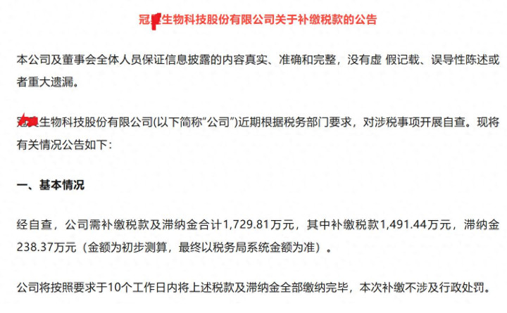 公司将按照条件于10个职责日内将上述税款及滞纳金一起交纳结束,本次补缴不触及行政处罚。