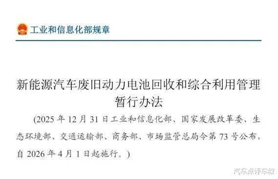2026年4月1日,由工业和信息化部、国度发展窜改委、生态环境部等六部门集合发布的《新能源汽车废旧能源电板回收和轮廓应用经管暂行倡导》(以下简称《倡导》)将追究奏效。这意味着新能源汽车后商场行将迎来一场深档次的功令重构。