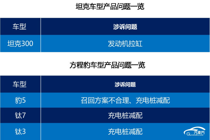 从两个品牌的涉诉车型组成看,坦克旗下多款车型的投诉指数只消两位数致使一位数,只消坦克300和坦克400新动力投诉指数过百。方程豹这边,由于遇到连合投诉,方程豹旗下的豹5、钛7和钛3投诉指数远高于坦克旗下的车型。