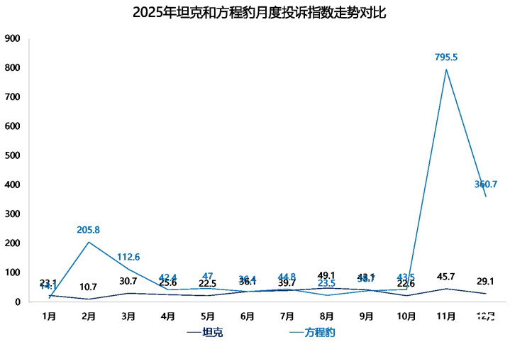 而从年度走势来看,2025年,坦克的单月投诉指数一直沉稳驱动,最高也未卓越50,在汽车门网的投诉指数名次中照旧是优秀水平。另一边,方程豹全年大部分期间里投诉指数皆与坦克在昆季之间,但2025年2月-3月和11月-12月,方程豹投诉指数全年资格了两次大的波动。也恰是这两次大的波动,蓦的举高了方程豹的投诉指数。