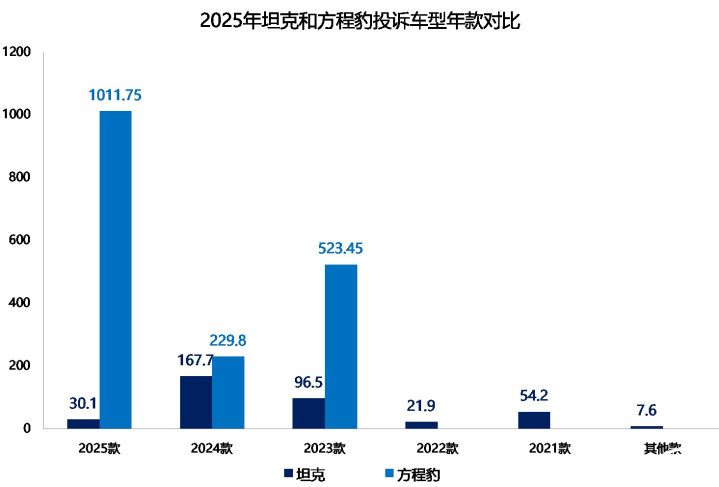 从涉诉车型年款来看,2025年,坦克和方程豹的投诉皆来自近三年内的新车。坦克品牌固然问世期间更早,但三年以上老车型的投诉率并不高。稍有不同的是,方程豹2025款车型和2023款车型的投诉更为连合。