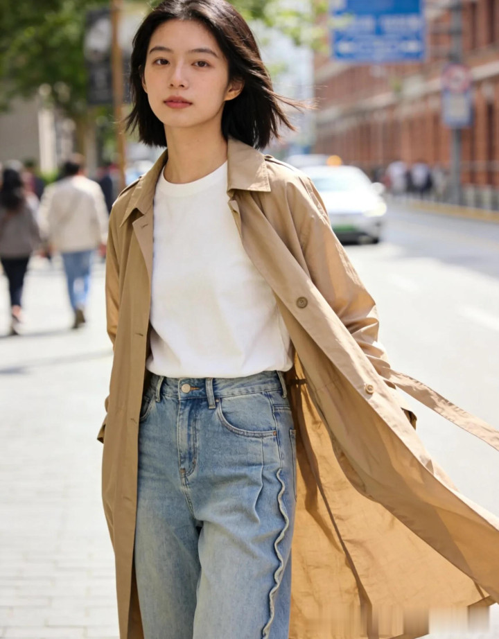 3. 薄风衣/衬衫外衣 + 从简内搭