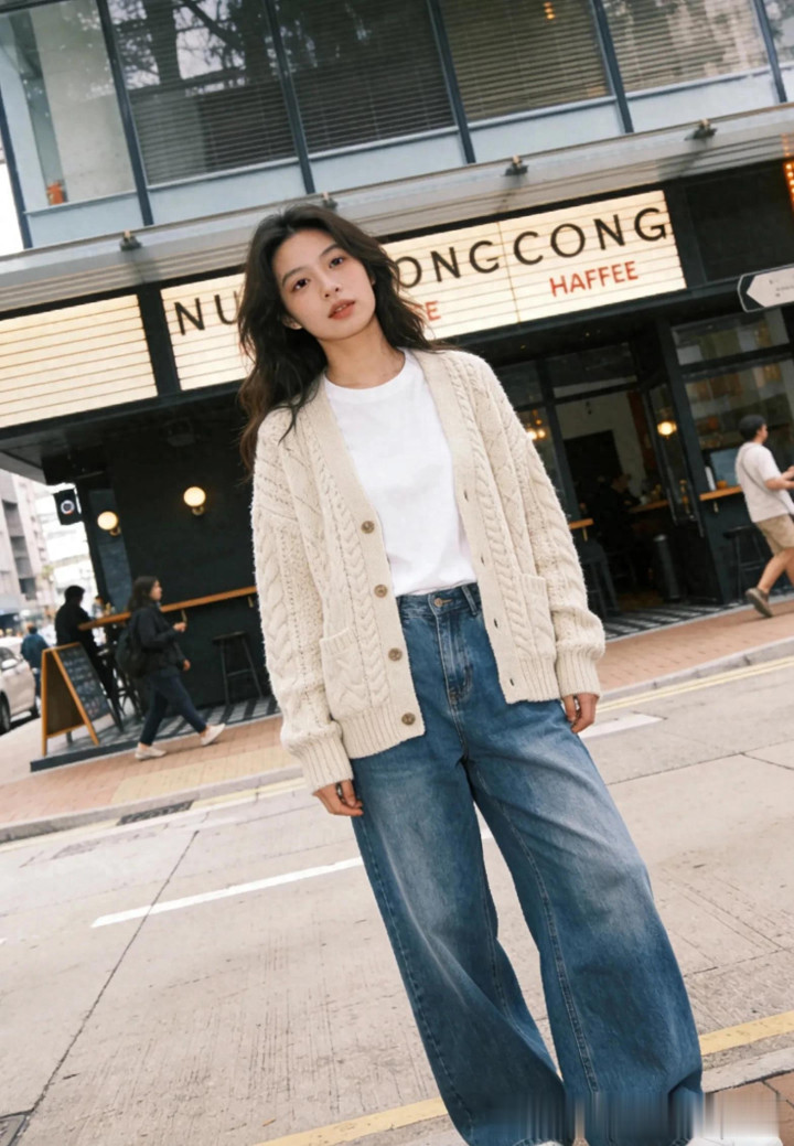 1. 真诚开衫 + 白T + 牛仔/阔腿裤