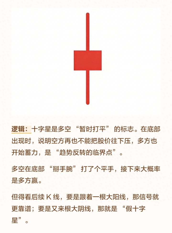 ⚠️ 感性辅导:十字星自身不代表标的,需要看后续K线形态:若后续出现大阳线,阐述多方情感运行占优;若出现大阴线,阐述空方力量仍占主导,是“假均衡”。