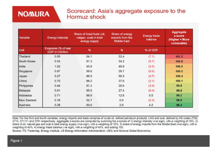 为了识别亚洲受现时动力冲击的影响进度,野村证券分析了四个参数:动力强度(化石动力)、动力结构、动力贸易均衡以及该地区对霍尔木兹海峡的依赖进度。