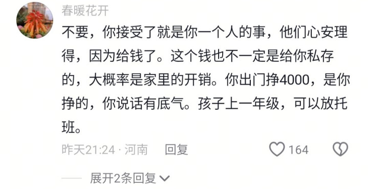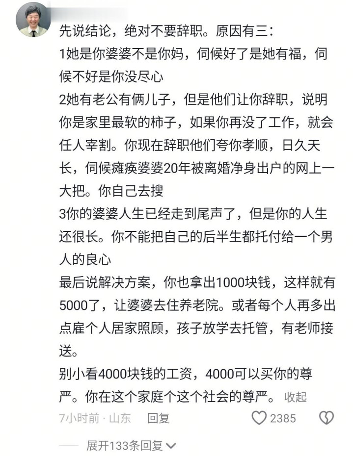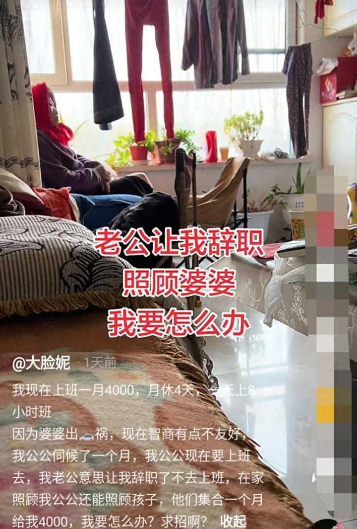 婆婆出车祸,才智受损,公公伺候一个月后贪图上班。儿媳妇上着4000元一个月的班,异域的老公要求夫妇离职柔顺婆婆,他给出的条目是他们(公公给3000块,小叔子给1000块,老公给1000块)一个月给5000块。要不要收受?女主向网友求援了。