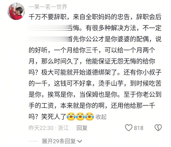 这届网友清一色的暴虐"千万不要辞!"的建议,一条条的信息,齐是以过来东说念主的身份给她说说念。