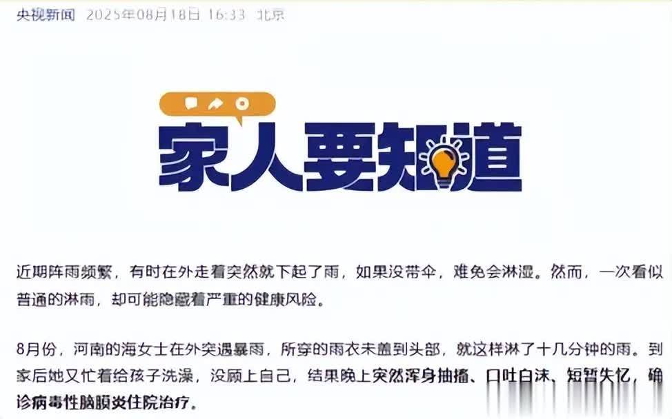 有东说念主只是在户外淋雨十几分钟,回家后就出现不绝高烧、剧烈头痛,临了被确诊为脑膜炎,险些危及人命。