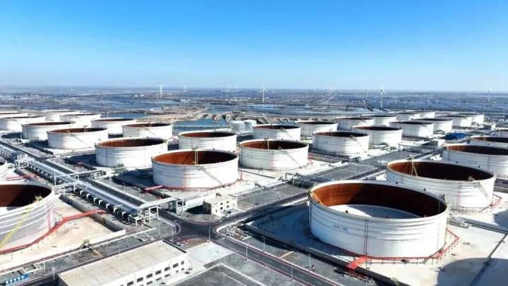 库容500万立方米的山东东营原油贸易储备库形貌。图源:中国石油石化