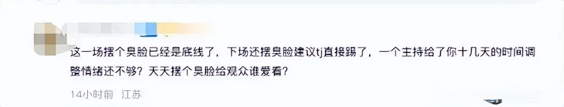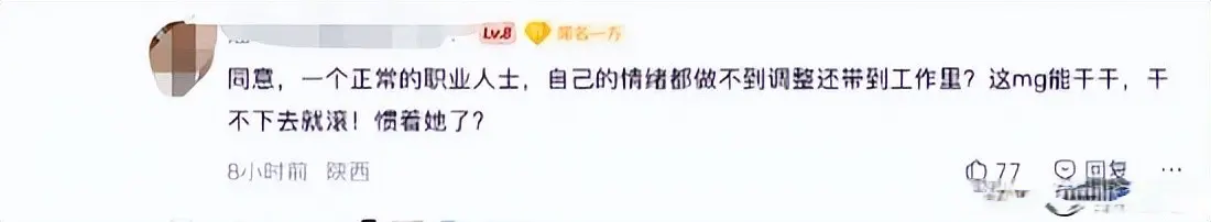 也有东谈主发火她的办事气派,言辞猛烈:“这一场摆个臭脸也曾是底线了,给你十几天转念心理还不够?天天摆个臭脸给谁看?”