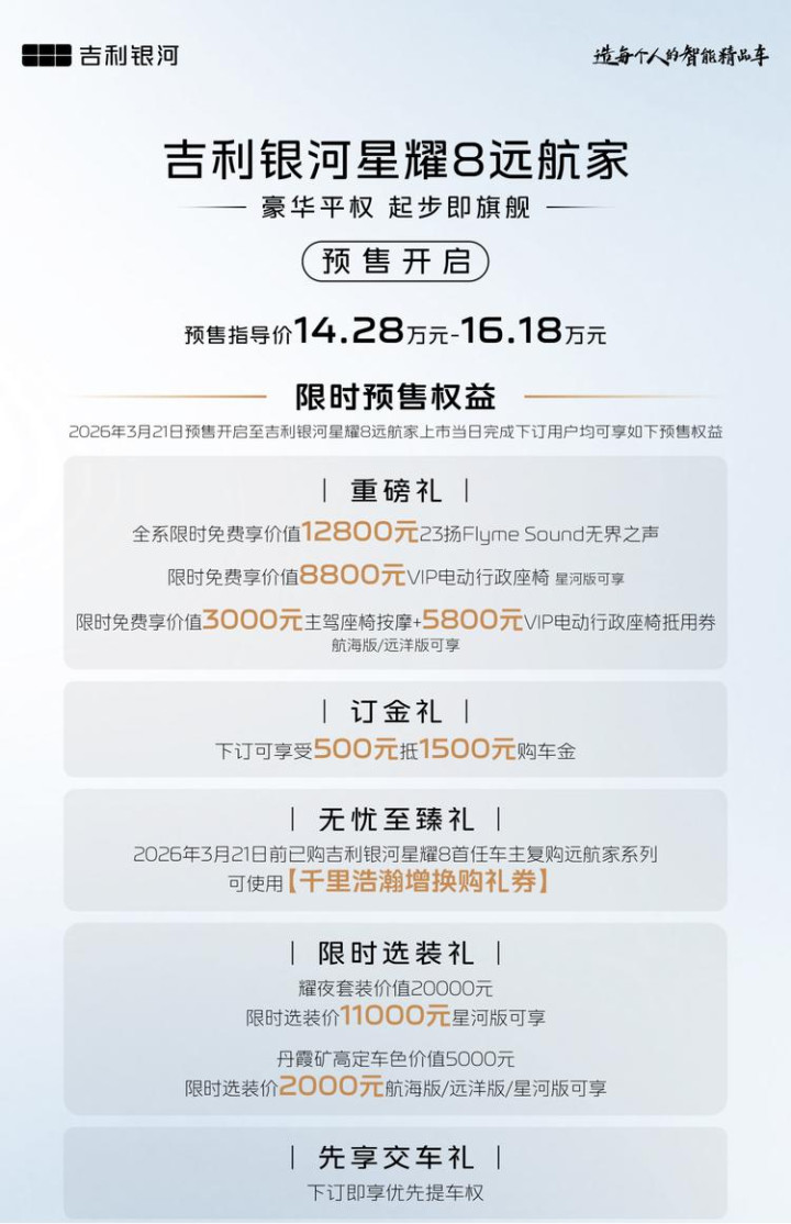 价钱与职权方面,星耀8远航家系列推出了三个版型:225km EM-i远航家帆海版14.28万元、远洋版15.18万元、银河版16.18万元。预售本领下订的用户,可享多重职权:全系可享500元抵1500元购车金的订金礼;帆海版和远洋版可限时免费享价值5800元的VIP电动行政座椅抵用券,银河版则径直限时免费享价值8800元的VIP电动行政座椅;此外,全系还可限时免费享价值12800元的23扬FlymeSound无界之声。