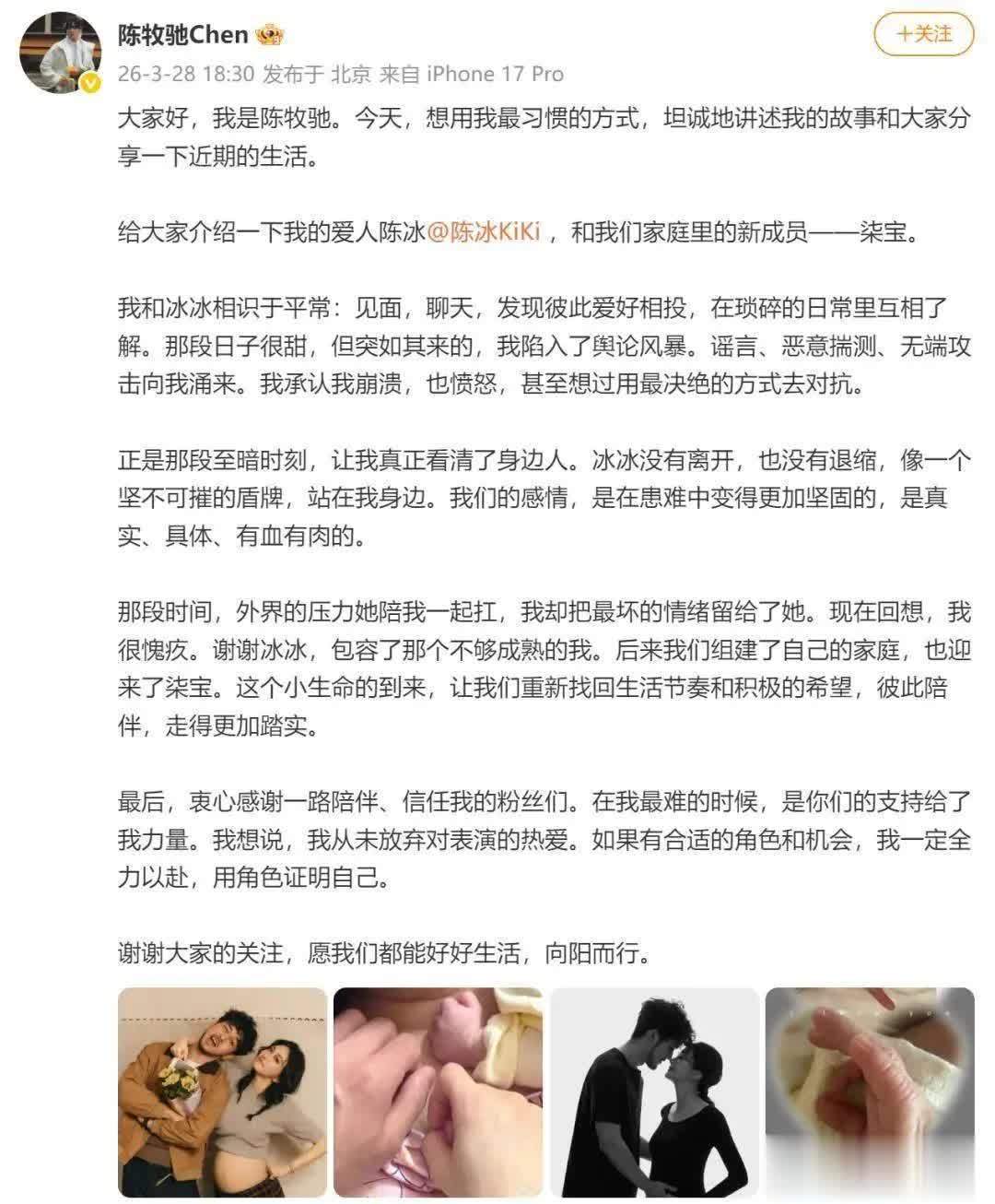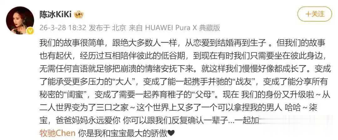 2026年3月28日,演员陈牧驰与歌手陈冰通过一场“慢直播”式的官宣,再度将公众视力眩惑至他们的心情世界。莫得效心计划的预报片,亦无煽情音乐映衬,仅凭借两篇千字长文以及几张充满生涯气味的像片,这对收支7岁的姐弟恋主角,历经三年时光,完成了一场从封闭相恋到公开家庭的“非典型叙事”。