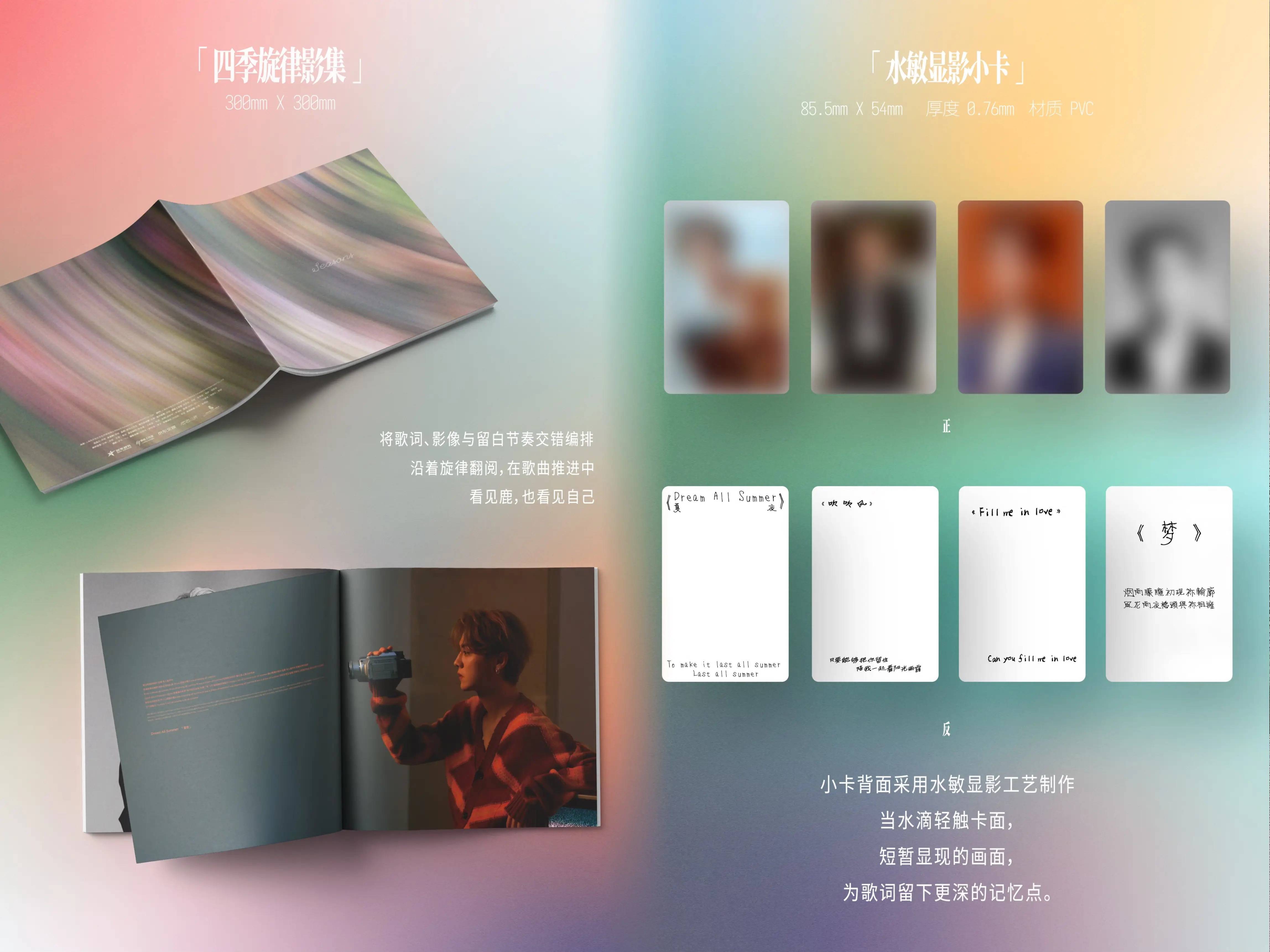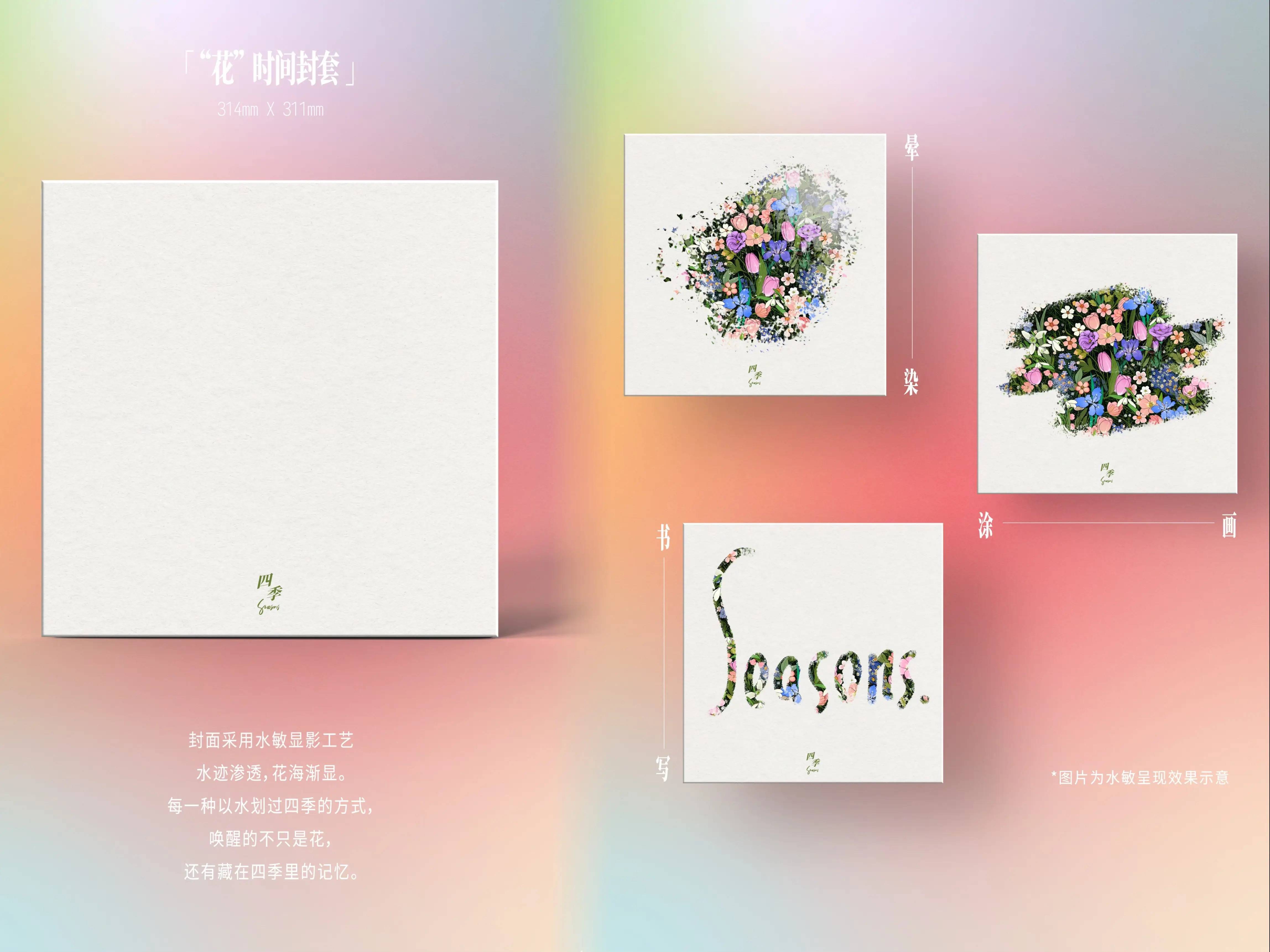《四季Seasons》以季节更替为叙事踪迹,在音乐中记载花式的变化与跟随的意旨。专辑封套与小卡均承袭水敏显影工艺制作:当水迹轻触名义时,隐藏的花海图案会逐渐夸耀;待水分当然蒸发后,画面恢收复状。图案在夸耀与褪色之间造成一次齐备的变化进程,也呼应了专辑中对于时辰流动与季节轮回的主题。