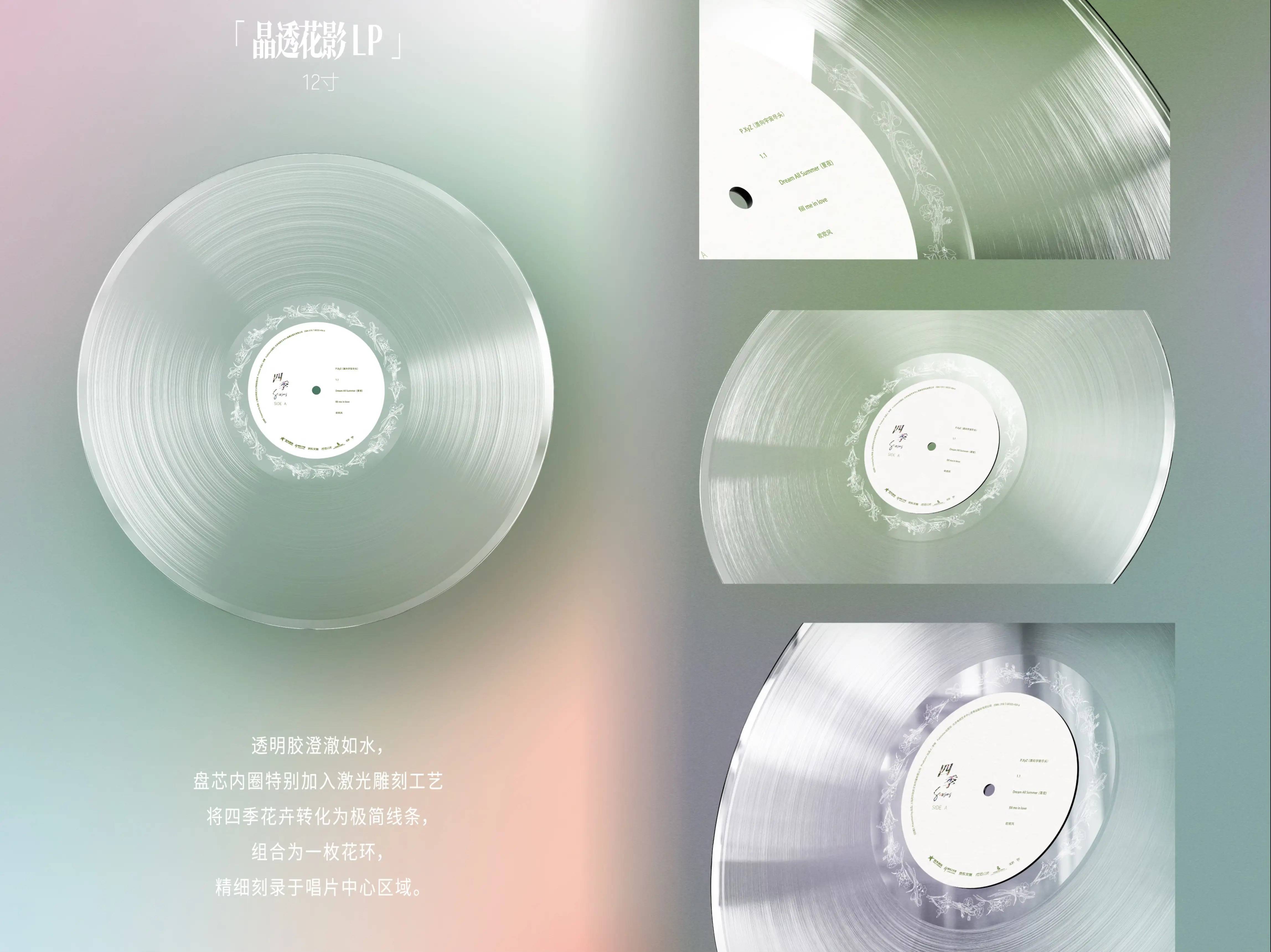 唱片承袭高透透明胶材压制,合座呈现表露、通透的视觉质感。盘芯内圈区域加入激光雕镂工艺,滚球app中国官方网站将春、夏、秋、冬具有代表性的花草飞舞为极简线条,并组合为一枚花环结构,细致刻录于唱片中心位置。跟着唱片旋转,雕镂线条在明朗下呈现出面绪变化,使音乐播放的进程同期造成可被不雅察的视觉恶果。