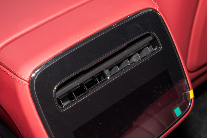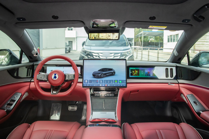 坐进车内,熔岩红主题配色搭配红线编织碳纤维材质,领路氛围径直拉满。三幅式领路概念盘带BOOST红色拨片,金属怀挡手感塌实,菱形绗缝一款式领路座椅支捏性和包裹感均衡得可以。中控遴荐13.2英寸边幅盘、17.3英寸中控屏、13.2英寸副驾屏三屏布局,50英寸AR-HUD昂首泄露、全场景智能语音、帝瓦雷剧院级声场(24扬声器)组成科技建立中枢。