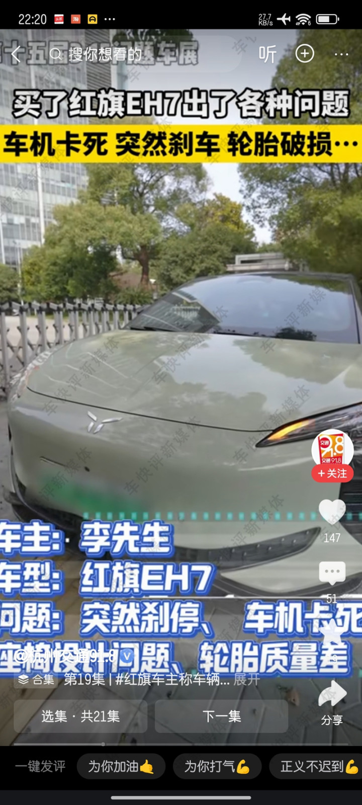 靠谱的滚球app中国官网 无故刹泊车机卡死轮胎质料差, 月销16辆的红旗EH7上热搜了
