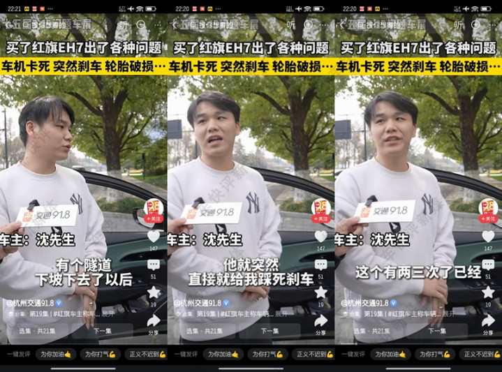 在本年3月15日杭州第15届315问题车展上,红旗EH7车主在现场维权上了热搜。有位车主示意他的这辆红旗EH7在行驶中前哨无破裂物的情况下霎时会时时出现自动缺点制动,主要出当今灵活进口、下坡路段以及夜间或者是暗影区域。