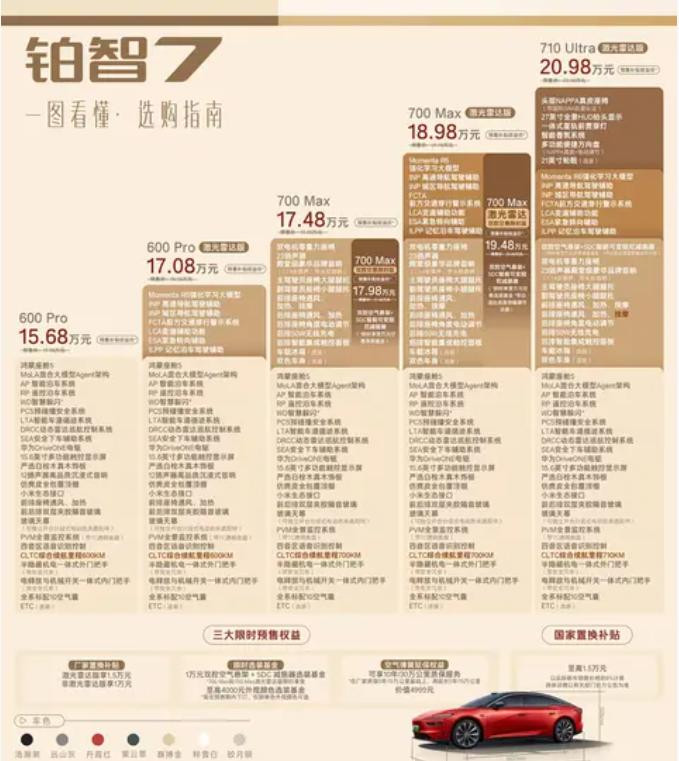 版块选购参考,各版块订价与成就对应了了,性价比阐扬突出:15.68万初学600 Pro版,即可领有鸿蒙座舱、真木饰板、座椅透风加热、20英寸轮毂等成就,初学便能享受豪华质感;叠加限时选装基金后,加5000元即可升级双腔空悬,17.98万就能起首双腔空悬版块,在同级车型中具备彰着上风;19.48万可集王人鸿蒙座舱、激光雷达、双腔空悬等中枢成就,顶配710 Ultra激光雷达版成就王人全,成就组合与订价在同级商场竞争力十足。