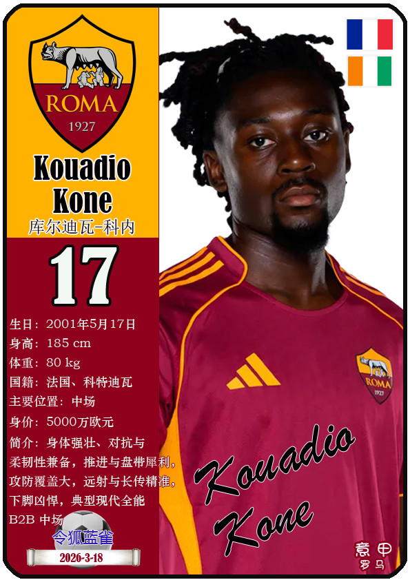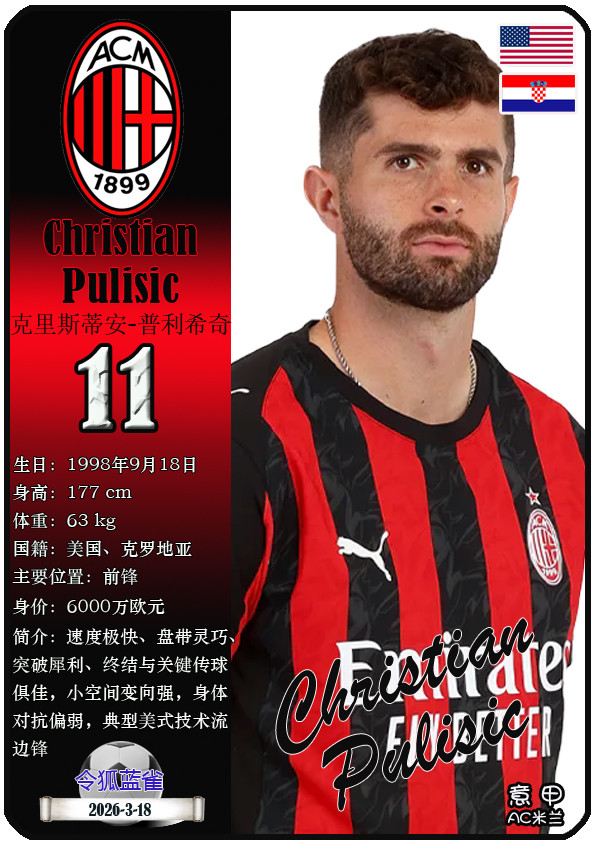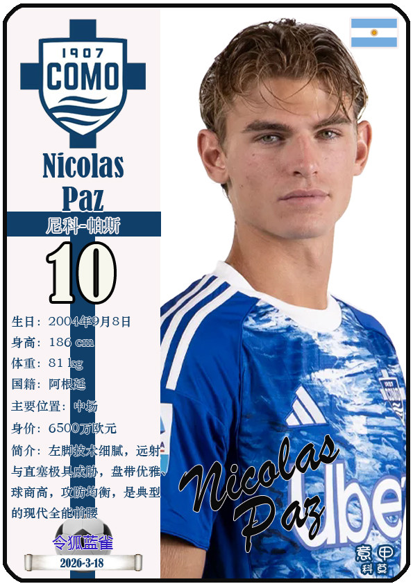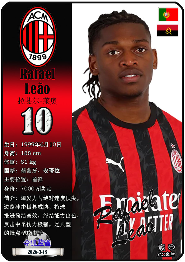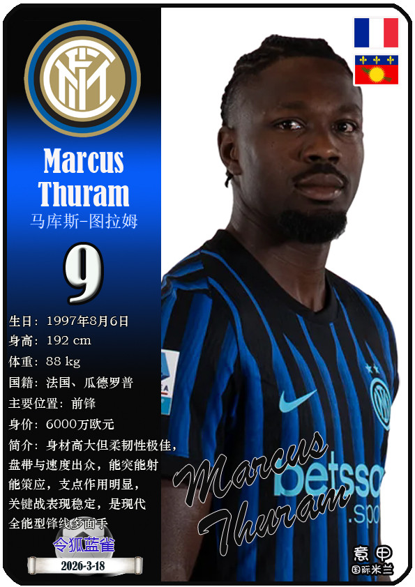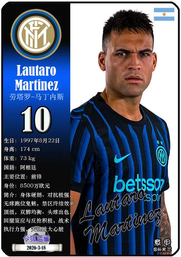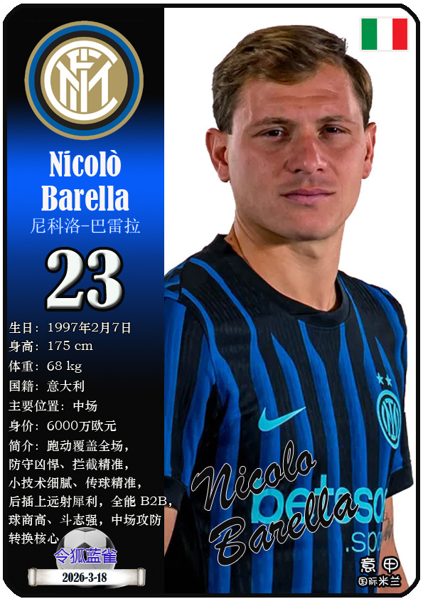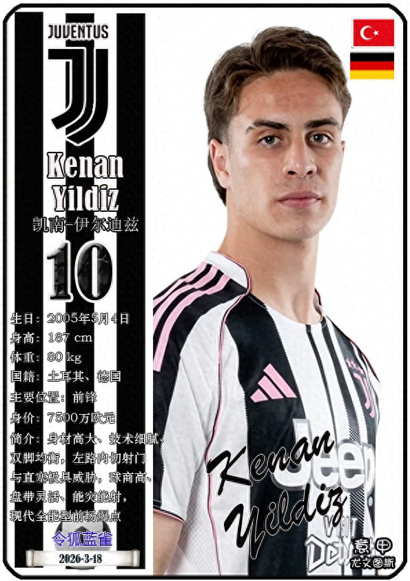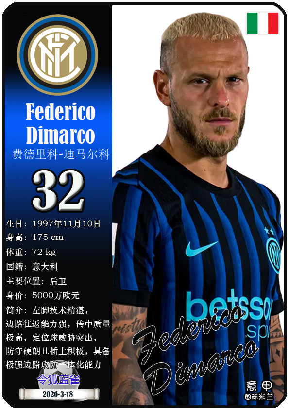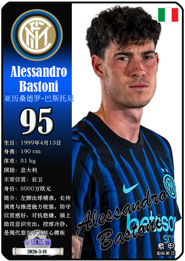 闭幕2026年3月19日,意大利足球甲级联赛身价为5000万欧及以上的球员共10名,本期盘货该10位球员(按所属俱乐部分类排序):