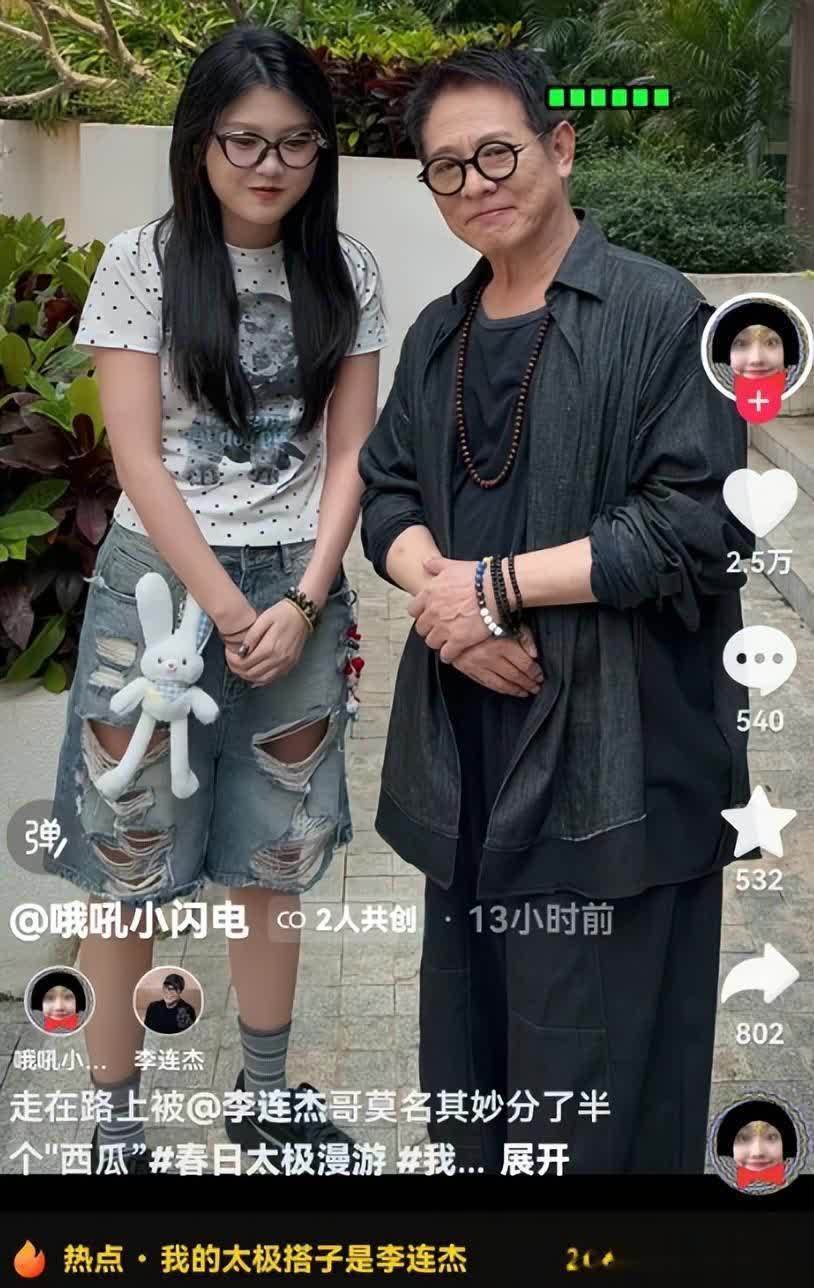 近日,李连杰与他东谈主合拍了一段有趣有趣的视频。画面肇端是一个女孩与东谈主争吵,蓦然李连特出当今女孩背后。画面中的他身着黑衣,脸上依旧戴着那副熟习的黑框眼镜,看得出心情可以,两东谈主仿若演戏般演绎着剧情。