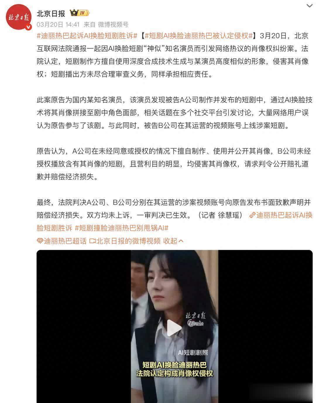 3月20日,国内顶流女星迪丽热巴(原告)将两家微短剧公司告上了法庭。原因令东说念主感触:在一部名为《逆骑》(44集、约90分钟)的微短剧中,女主角的脸居然被AI时刻“无缝替换”成了迪丽热巴的神气。这部剧在多个应答平台和视频账号上落拓传播,广博不解真相的粉丝和路东说念主还觉得这位一线大咖不顾《白昼提灯》的宣传,“自降身价”去拍了土味微短剧。