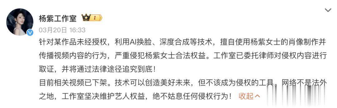 就在本年3月20日,迪丽热巴案件通报的团结天,另一位顶流女星杨紫的责任室也发布了刚烈声明。声明直指某作品未经授权,足下AI换脸、深度合成等时刻,私自使用杨紫的肖像制作并传播视频实质,严重骚扰了其正当职权。