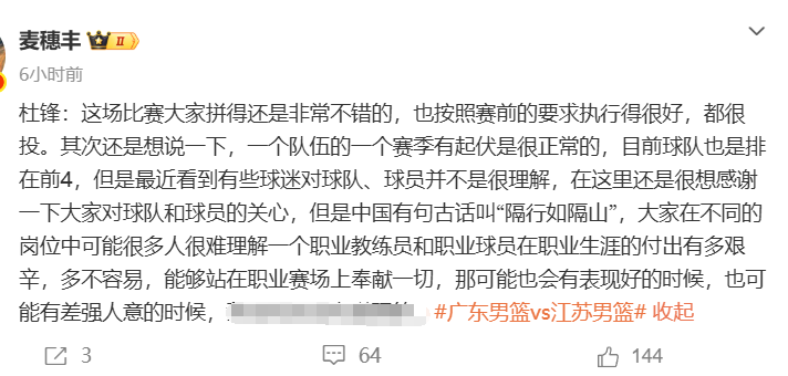 赛后杜锋荒原在发布会上喊话广东球迷要包容球队(杜锋说了快要5分钟,相称罕有),还说了好多话饱读吹和细则张皓嘉这段时分的孝顺。