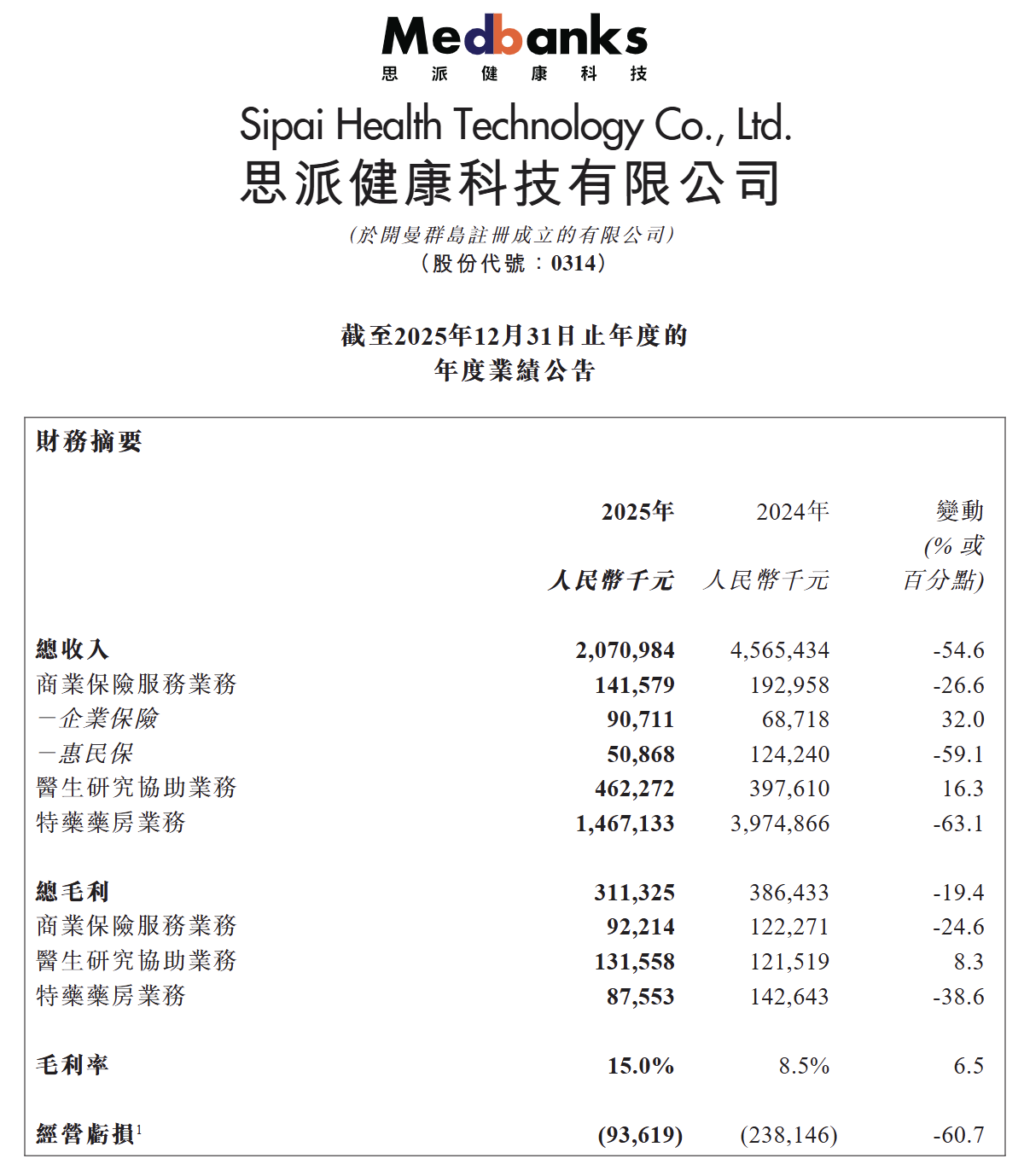 3月30日,腾讯系医疗健康平台念念派健康(00314.HK)交出2025年景绩单。一方面,总收入从45.65亿元骤降至20.71亿元,同比下滑54.6%,IFRS口径归母净亏欠1.27亿元;另一方面,中枢业务逆势增长,毛利率从8.5%跃升至15.0%,主义性现款流由负转正达635.5万元。