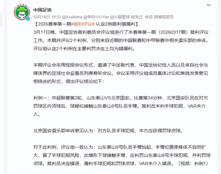 中超联赛第二轮焦点战京鲁大战中,山东泰山队主场2-1投诚北京国安。这场比赛戒指多日后,终于迎来最新进展,中国足协于3月18日19点52分施展官宣发声,本场比赛主裁判麦麦提江及视频裁判唐顺皆构成的裁判组,存在彰着漏判动作。