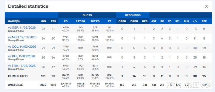 姜怡瑟五场比赛拿到93分是D组第一,场均26.2分钟,拿到18.6分3篮板1.8助攻1.6抢断,掷中率43.2%,三分掷中率41.5%,场均掷中5.4个三分球。
