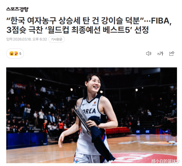 北京时间3月18日韩媒《体育倾向》写说念:韩国女篮晋级寰宇杯正赛多亏了姜怡瑟,FIBA王人对她的三分有目共赏,她入选了D组的最好声势。