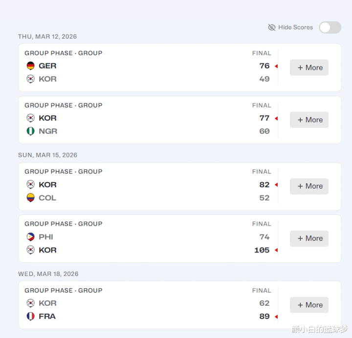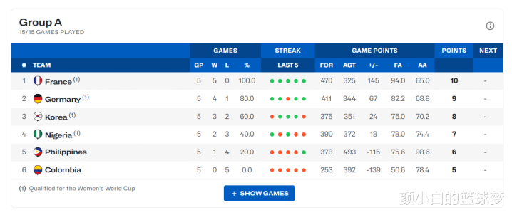 韩国队仅输给了两支顶级强队:49-76德国、62-89法国,其余的三场比赛77-60尼日利亚、82-52哥伦比亚、105-74菲律宾。赢下的这三场比赛韩国队的中枢姜怡瑟推崇王人相称出色。